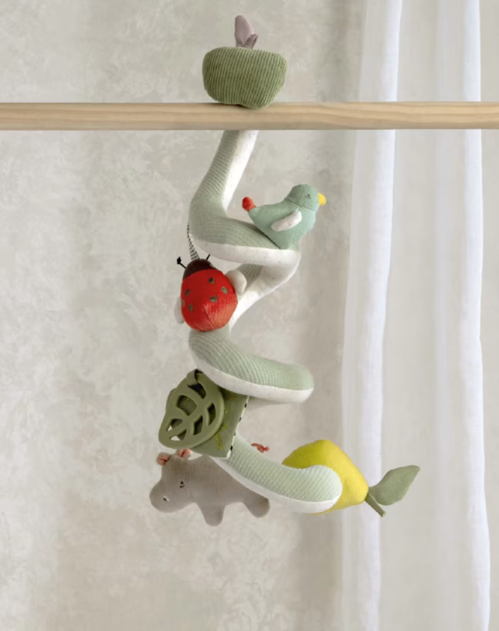 A practical activity spiral that keeps curious babies engaged from day one. The spiral design attaches easily to car seats, pushchairs, cribs or carrycots, hanging securely from any bar or frame, while soft textured 3D animals and colourful fruits offer sensory interest. Hidden crinkle textures, rattles and squeakers add play, making this Born To Be Wild toy from Mamas & Papas ideal for travel or quiet time.