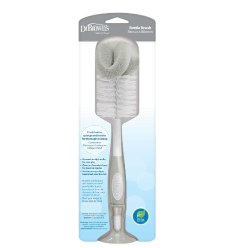 Features a combination sponge and bristle brush head for thorough, easy cleaning of bottles and chevron channels at the base of the brush to clean teats. Suction at the end enables the brush to stand up on the draining board for hygienic drying.